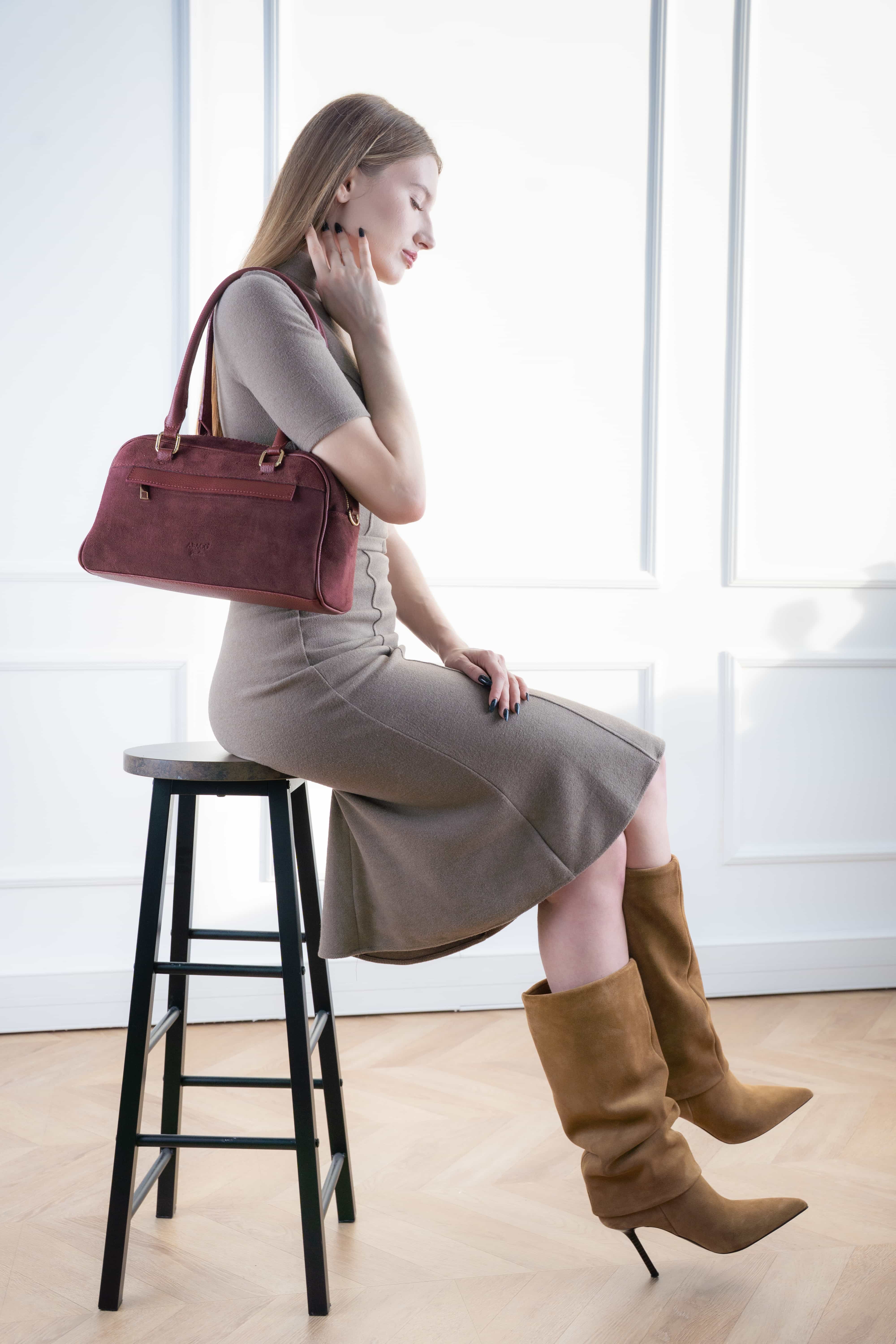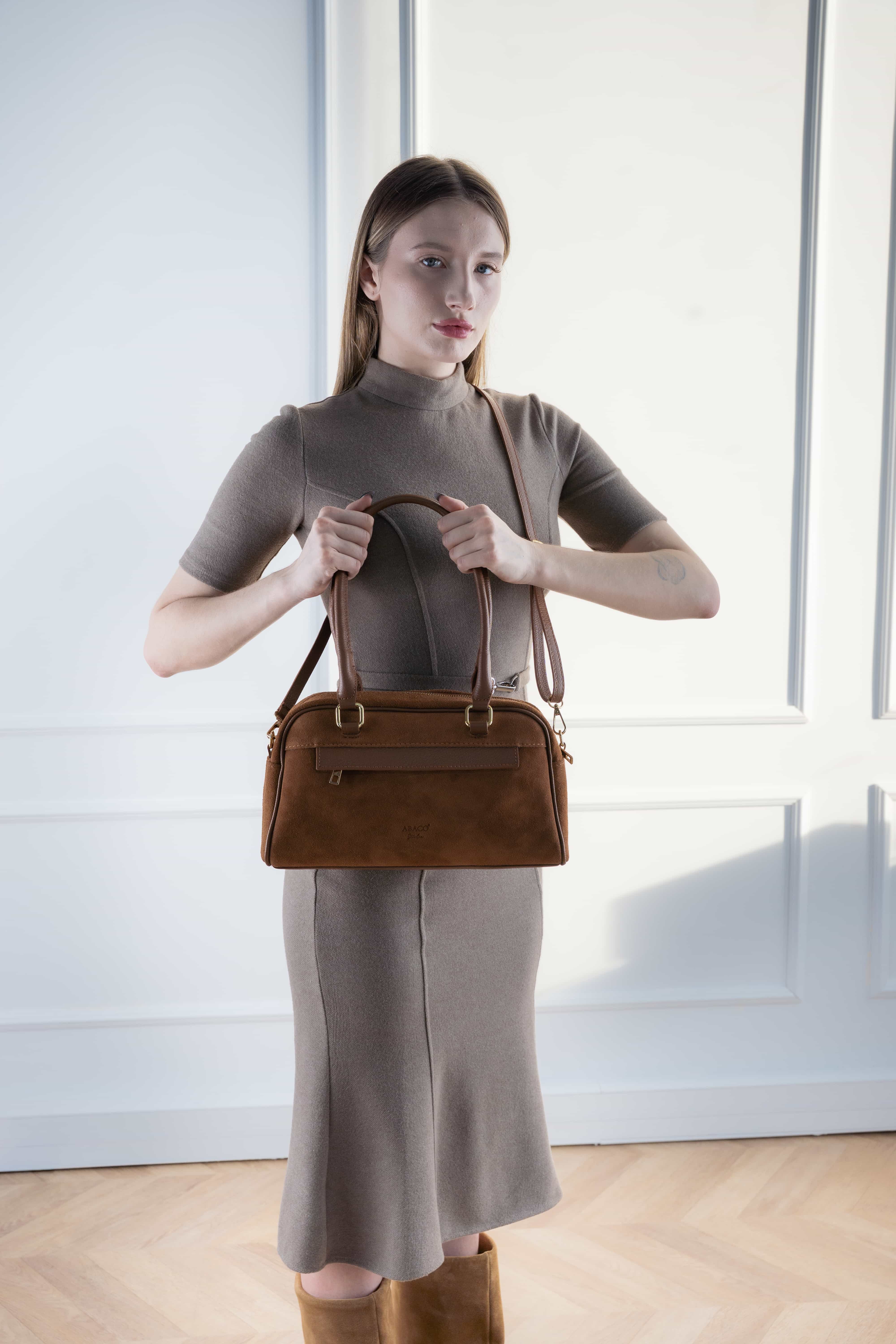 Le sac Drew est un sac structuré en suède et cuir de vachette à la silhouette chic. Porté main élégant, bandoulière amovible, fermeture zippée et poche intérieure. Un modèle raffiné et pratique pour le quotidien.