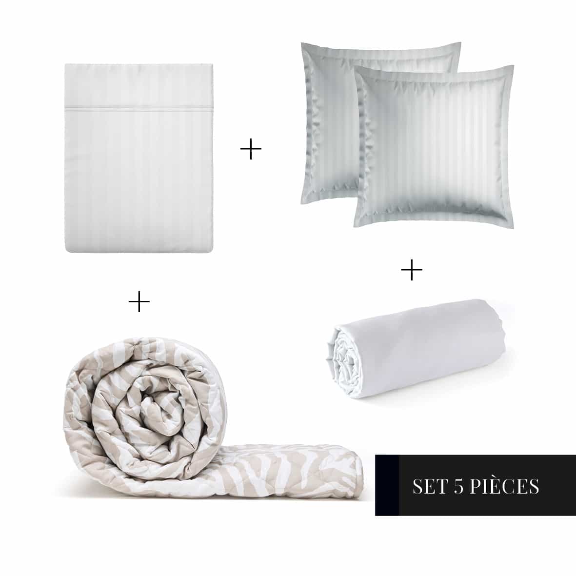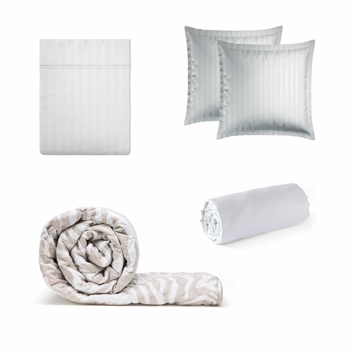 Ensemble de draps + couvre-lit de cotton satin – Dobby stripe woven / Evasion zébrée Blanc / Taupe