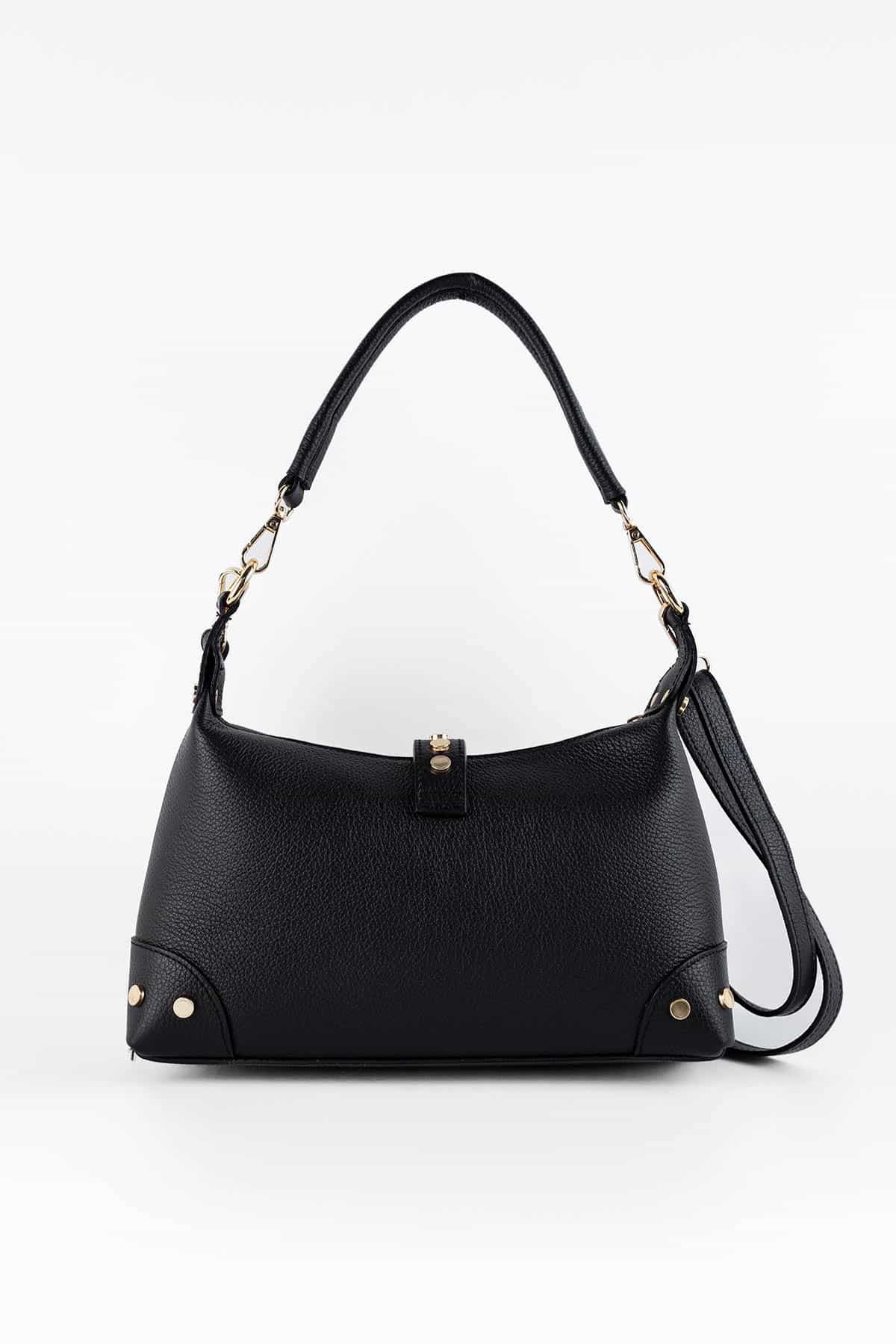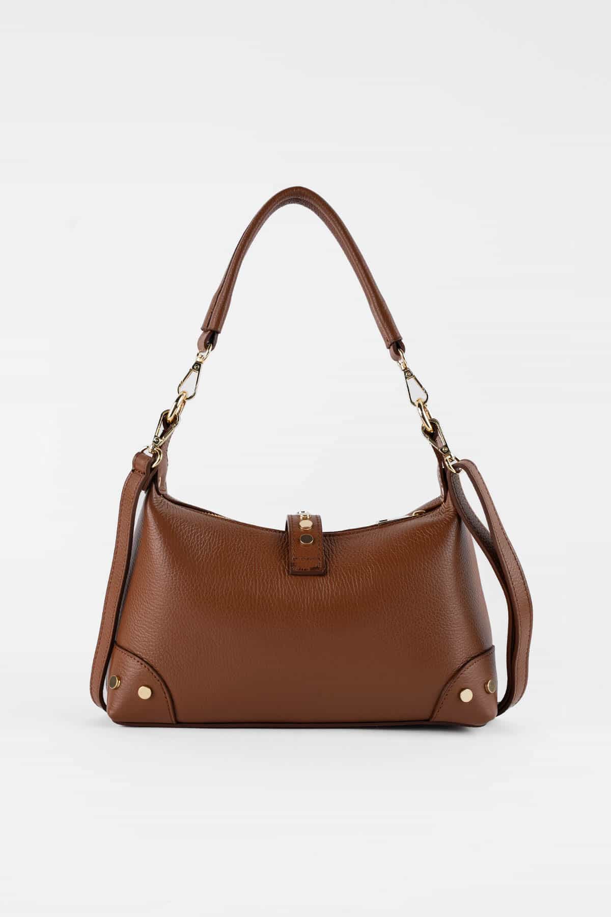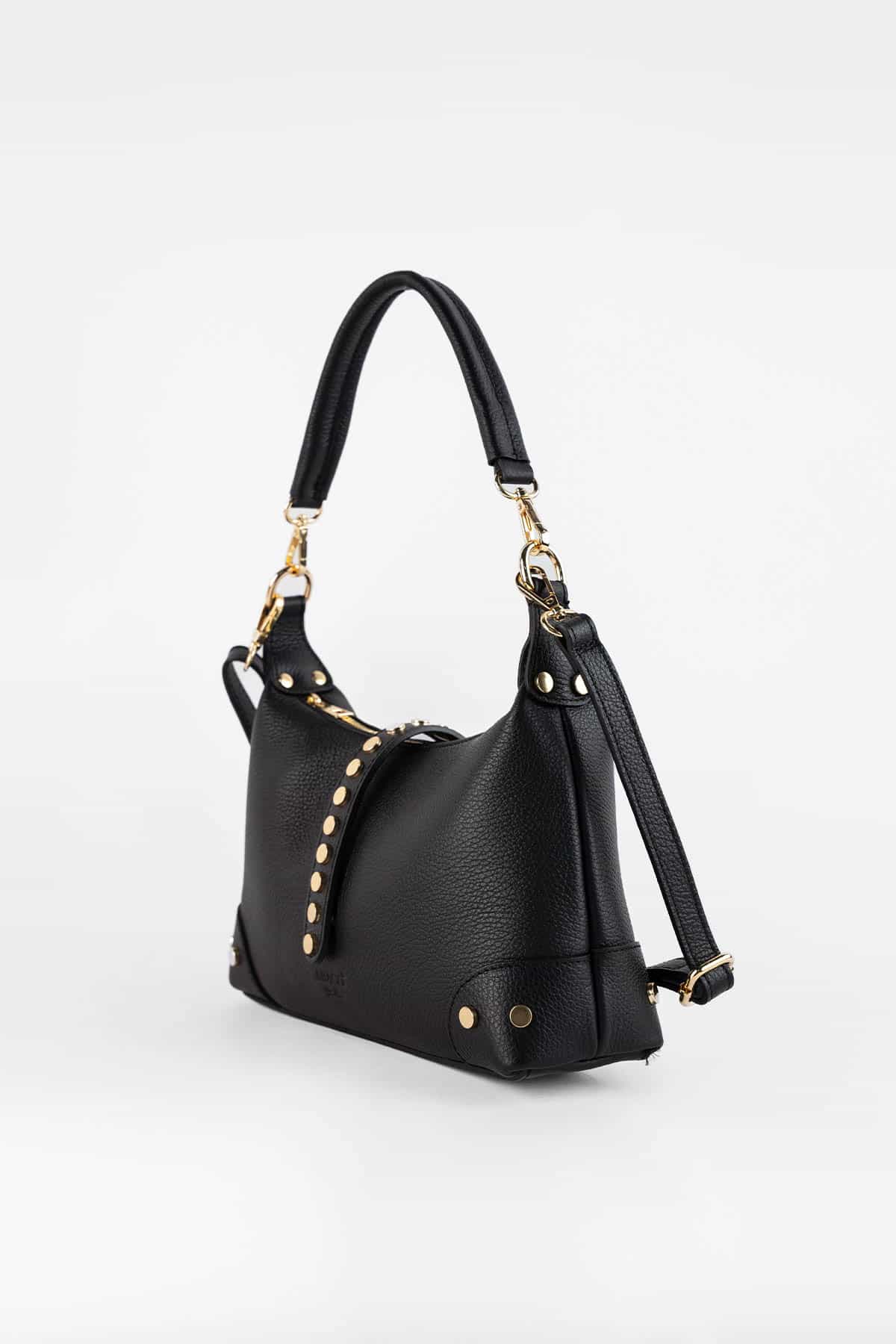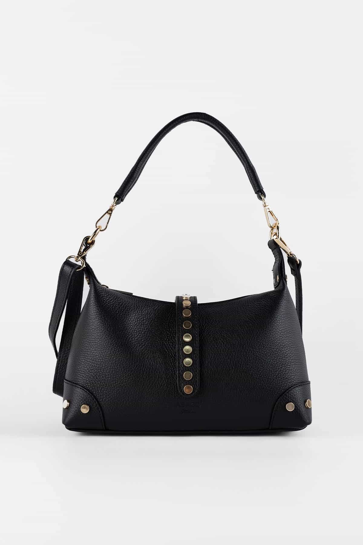 Le sac Jim affiche une allure moderne et affirmée avec son cuir de vachette et sa bride décorative ornée de rivets dorés. Ses coins renforcés et ses finitions métalliques lui donnent un look structuré et tendance.