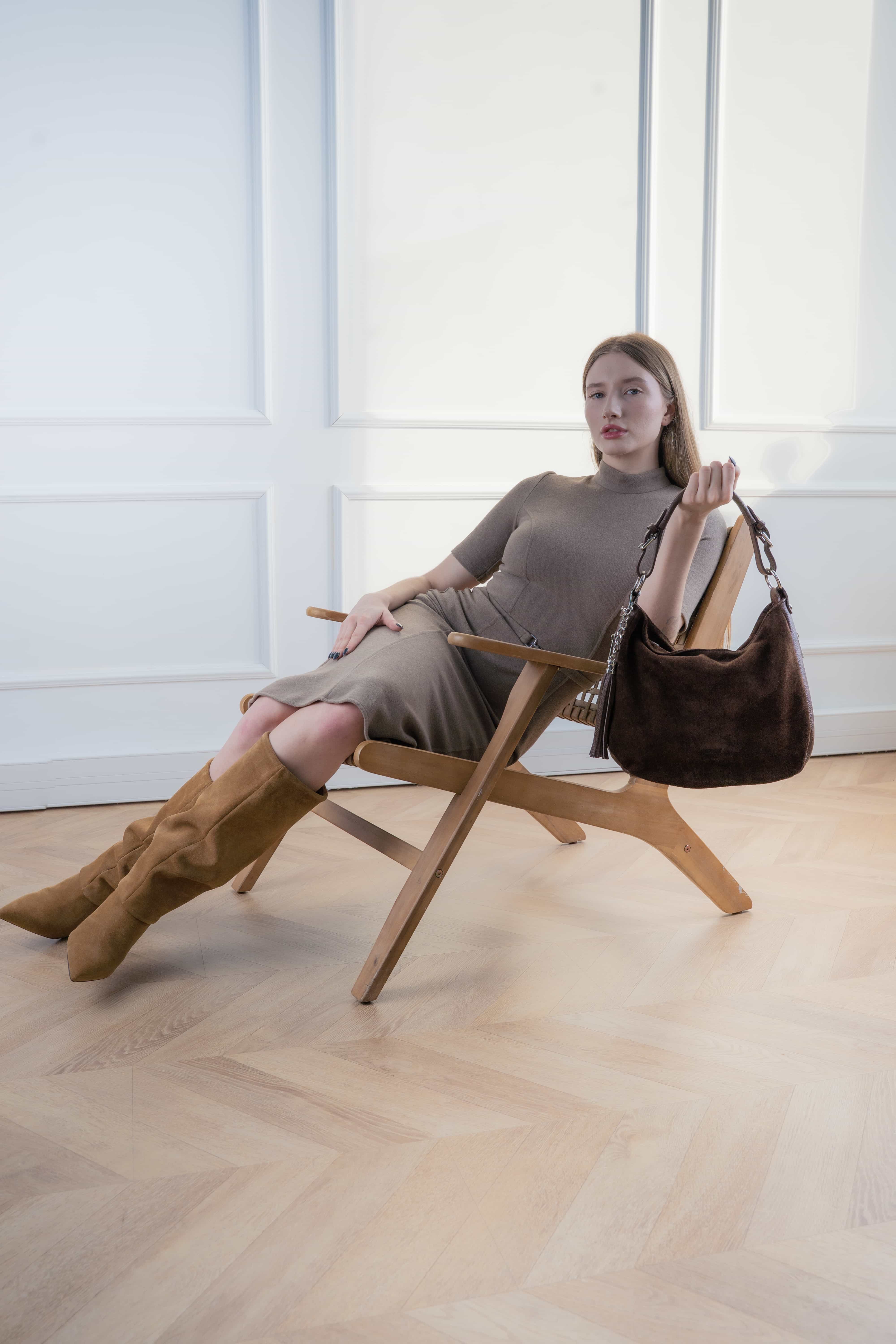 Le sac Kai mêle suède de vachette et cuir lisse de vachette pour un look bohème chic. Son détail signature : un grand pompon frangé suspendu à une chaîne argentée, qui ajoute mouvement et caractère. Sa fermeture zippée sécurise un intérieur spacieux, parfaitement doublé, avec une poche zippée et une bandoulière assortie pour un porté épaule ou croisé.
