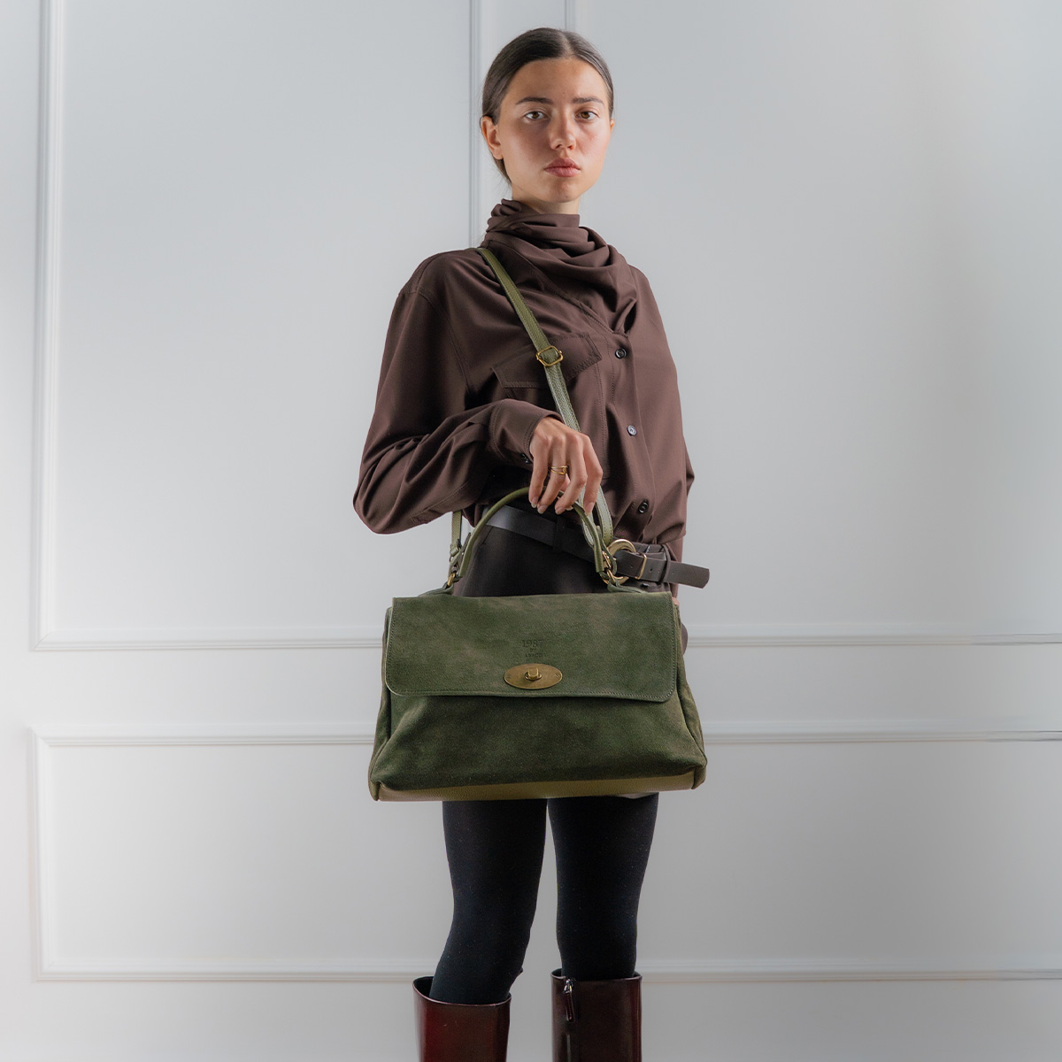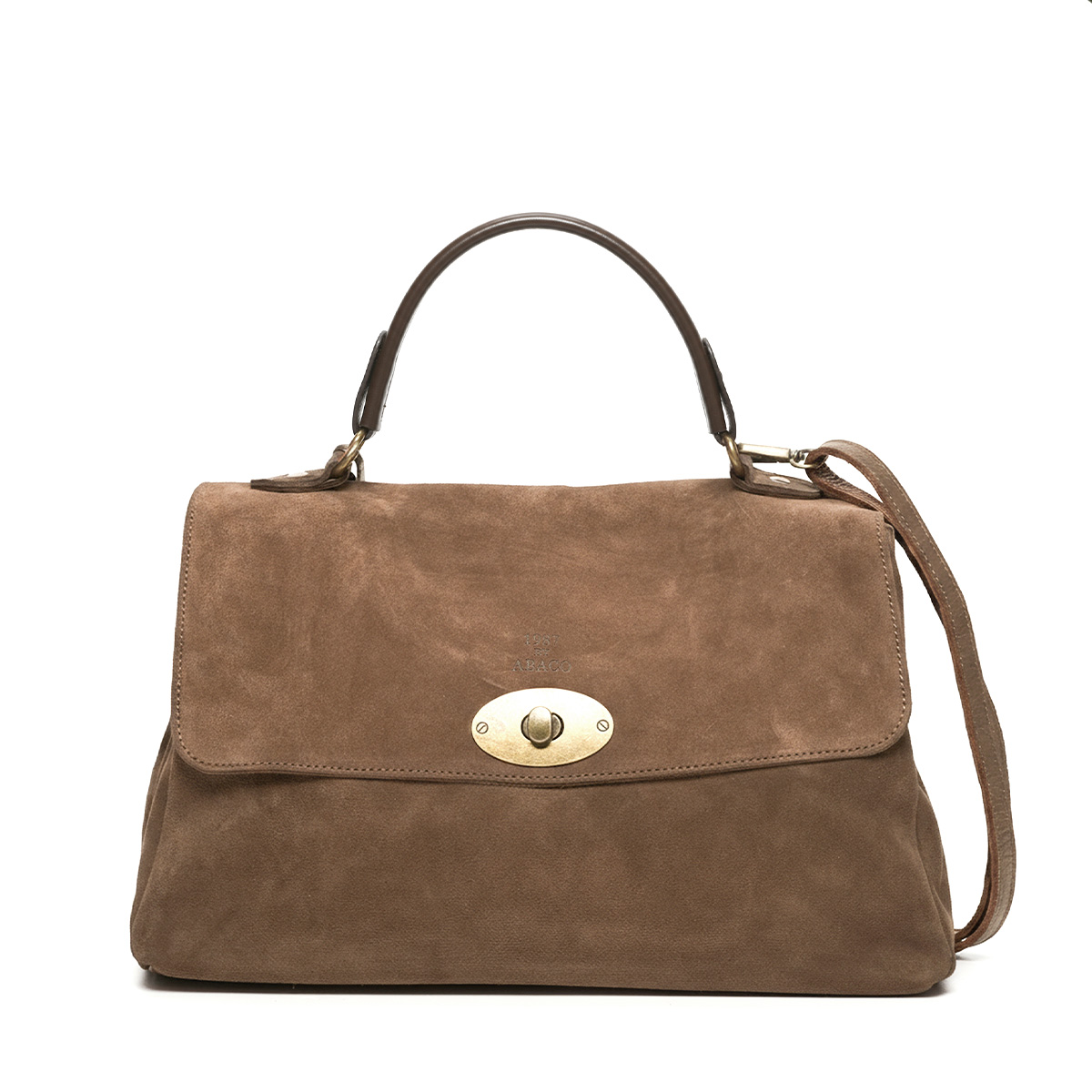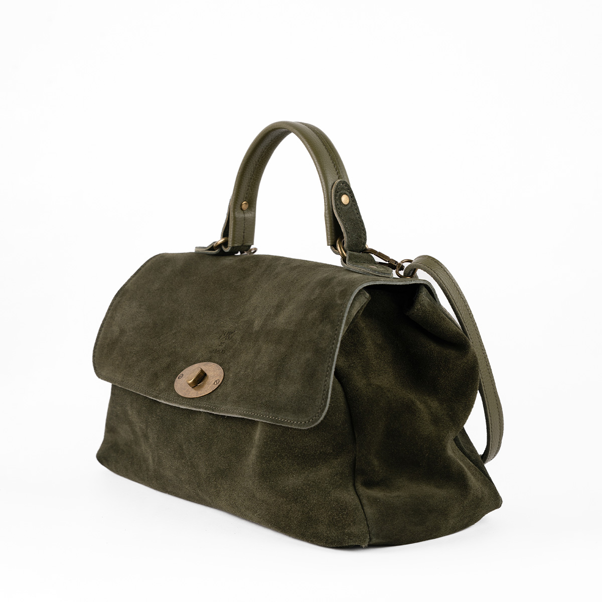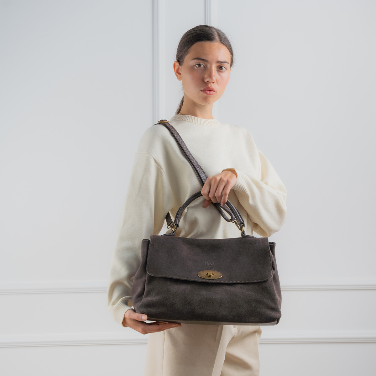Sac à main avec bandoulière réglable et fermeture principale par bouton tournant en métal.