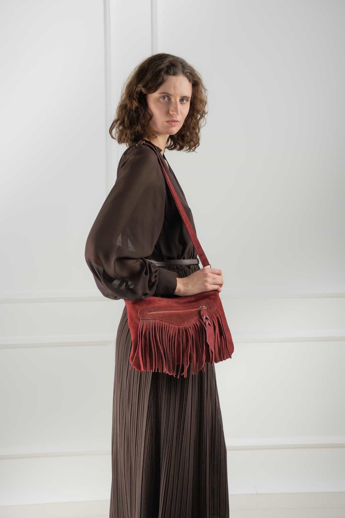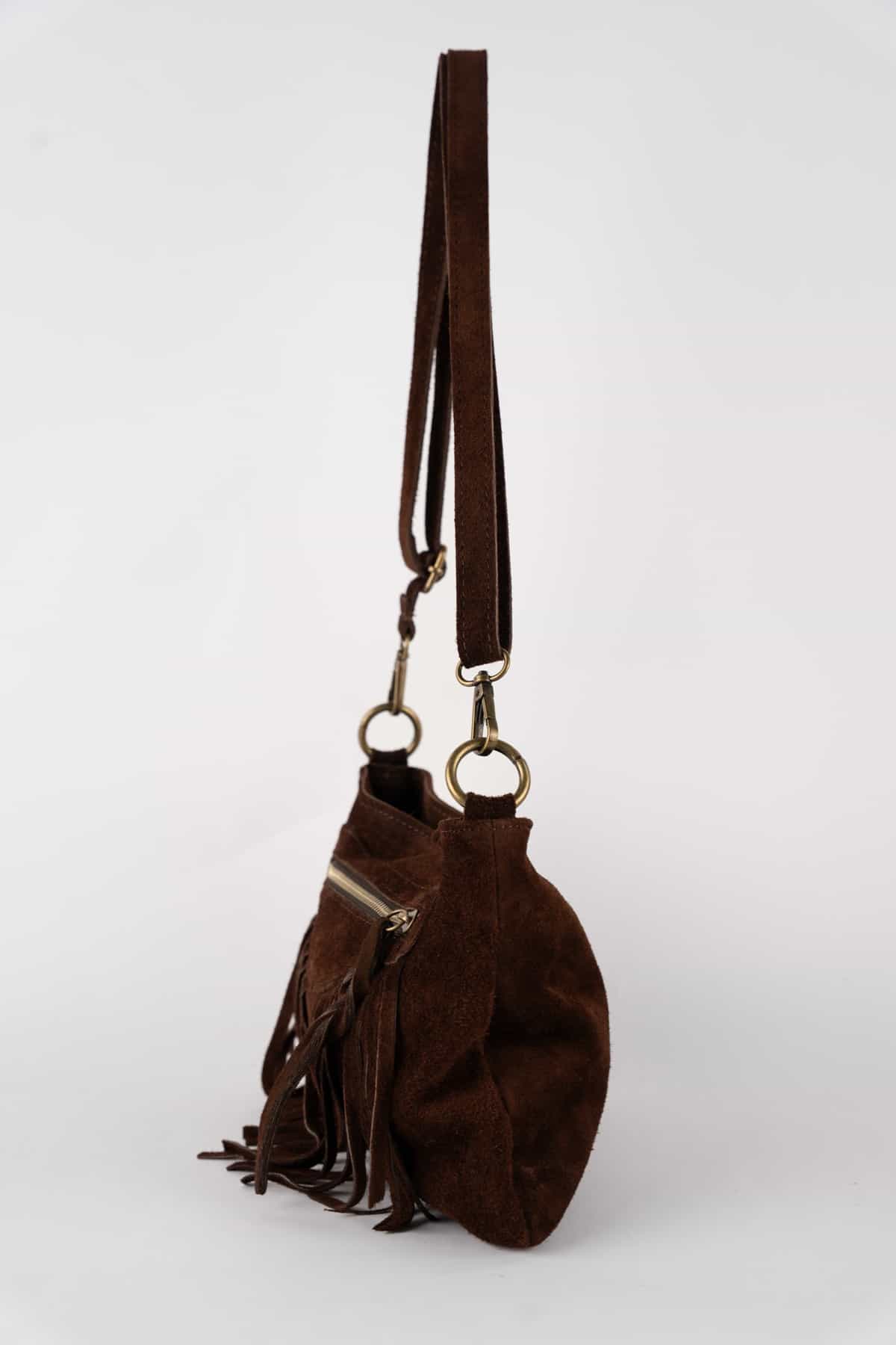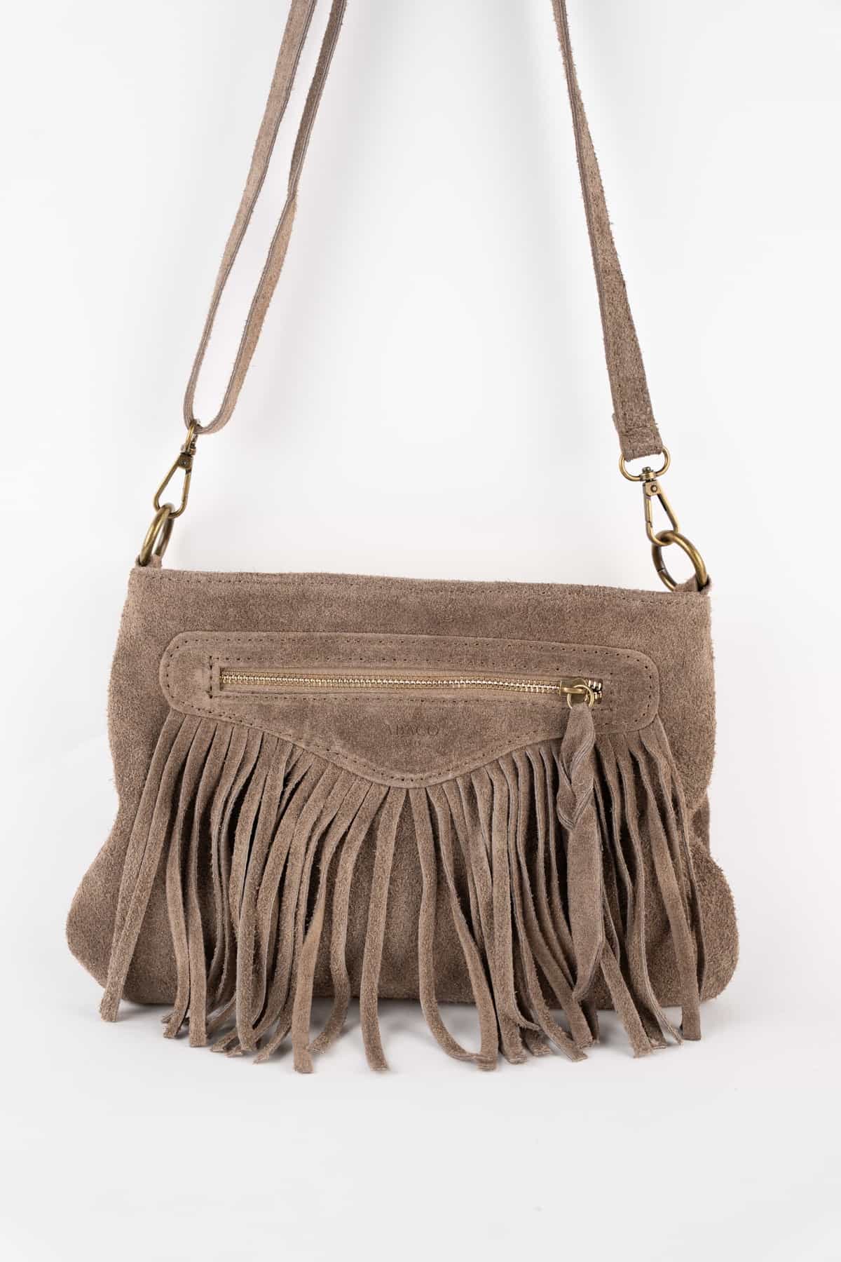 Le sac Nox est en cuir suédé brun orné de longues franges pour un look bohème chic. Poche avant zippée, fermeture principale sécurisée et intérieur doublé avec poche. Bandoulière ajustable. Un modèle tendance, plein de caractère.