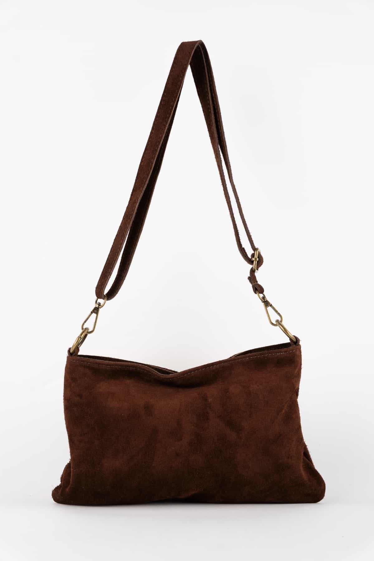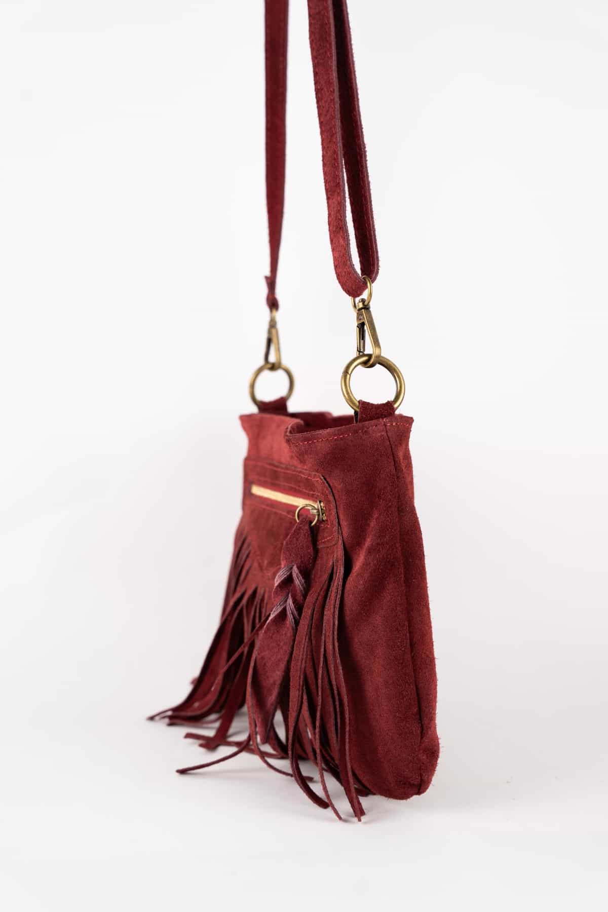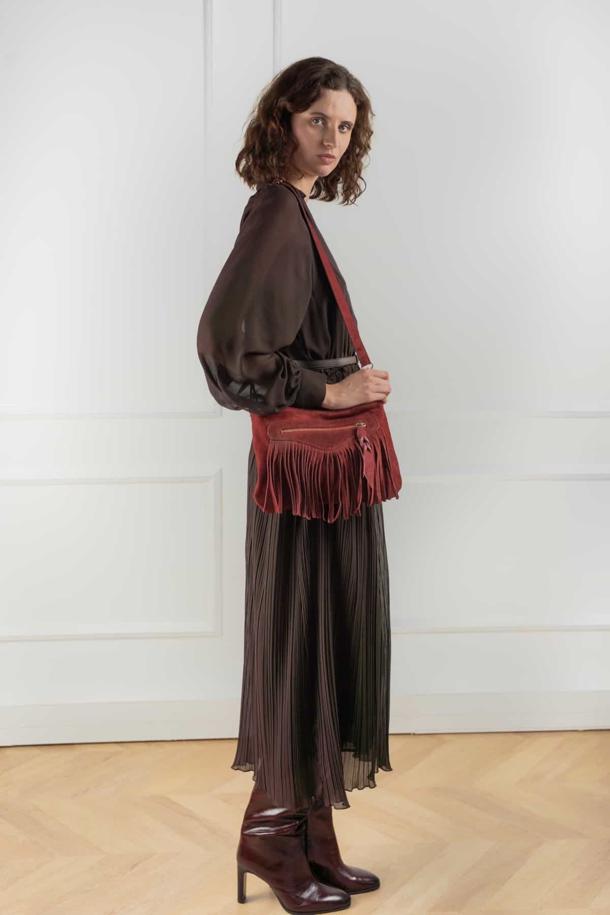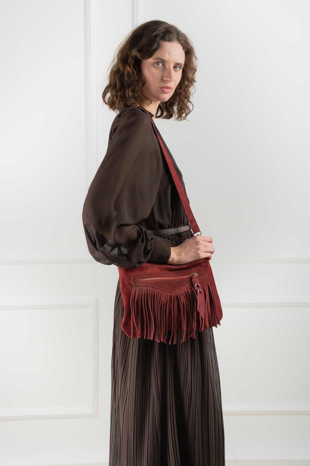Le sac Nox est en cuir suédé brun orné de longues franges pour un look bohème chic. Poche avant zippée, fermeture principale sécurisée et intérieur doublé avec poche. Bandoulière ajustable. Un modèle tendance, plein de caractère.