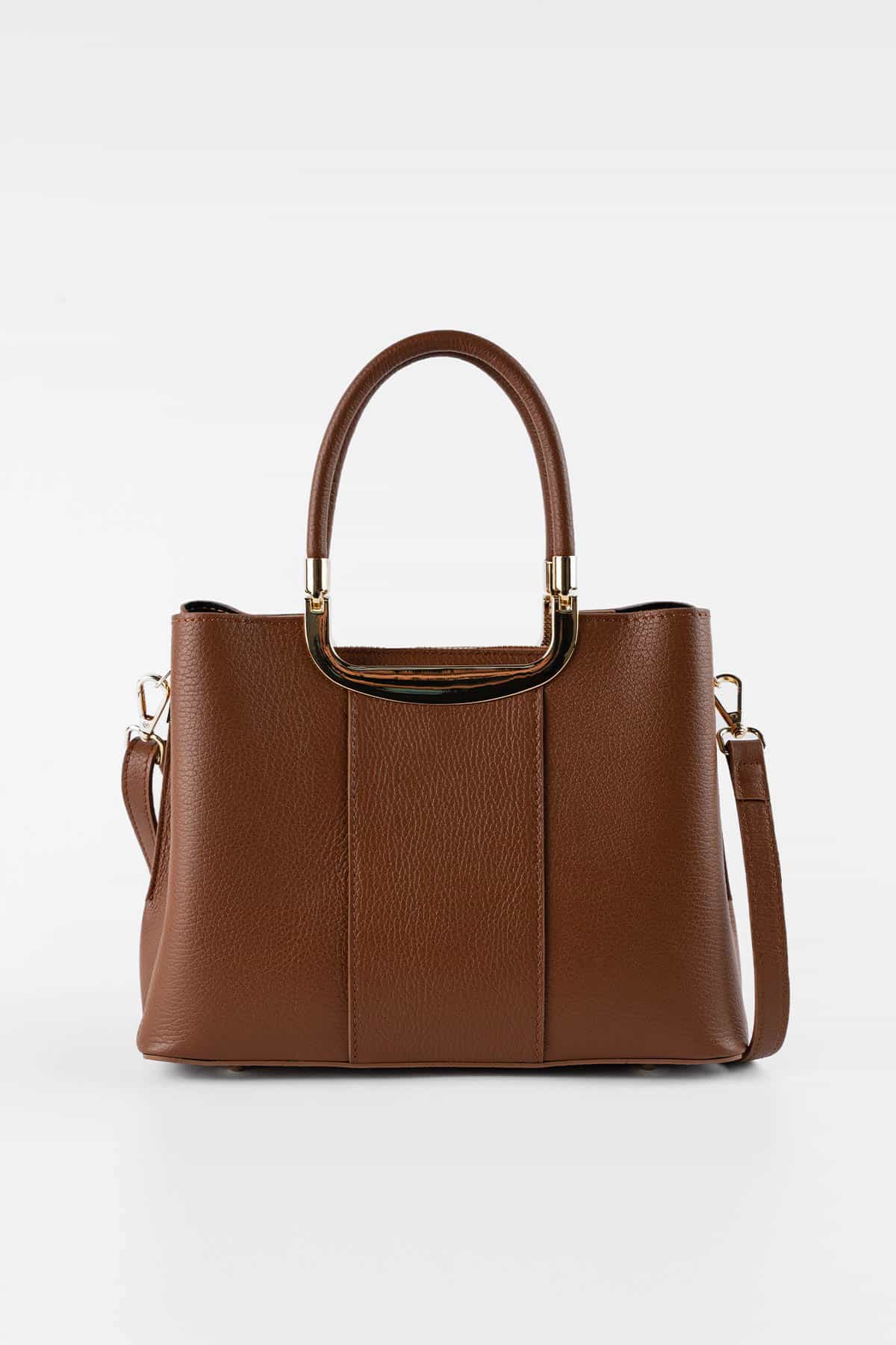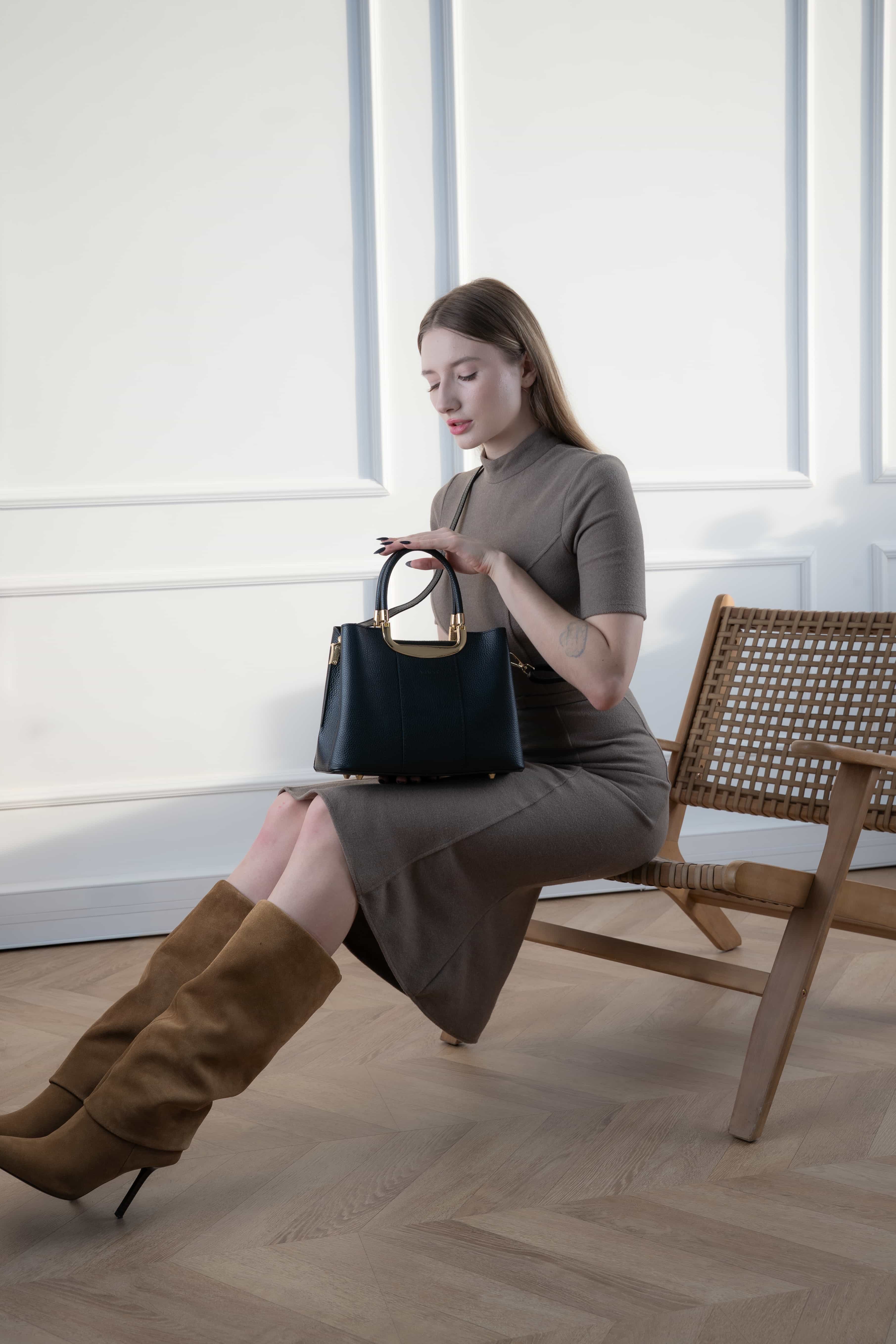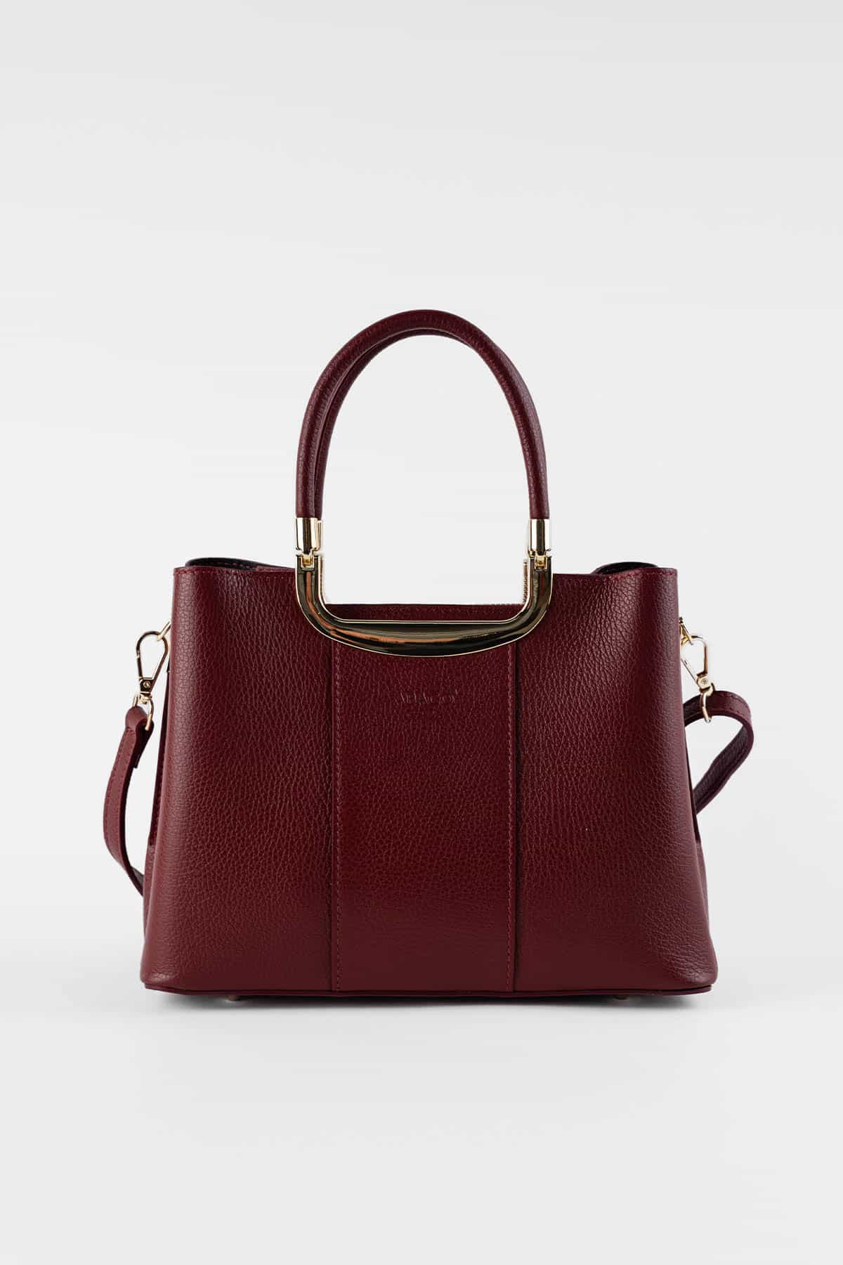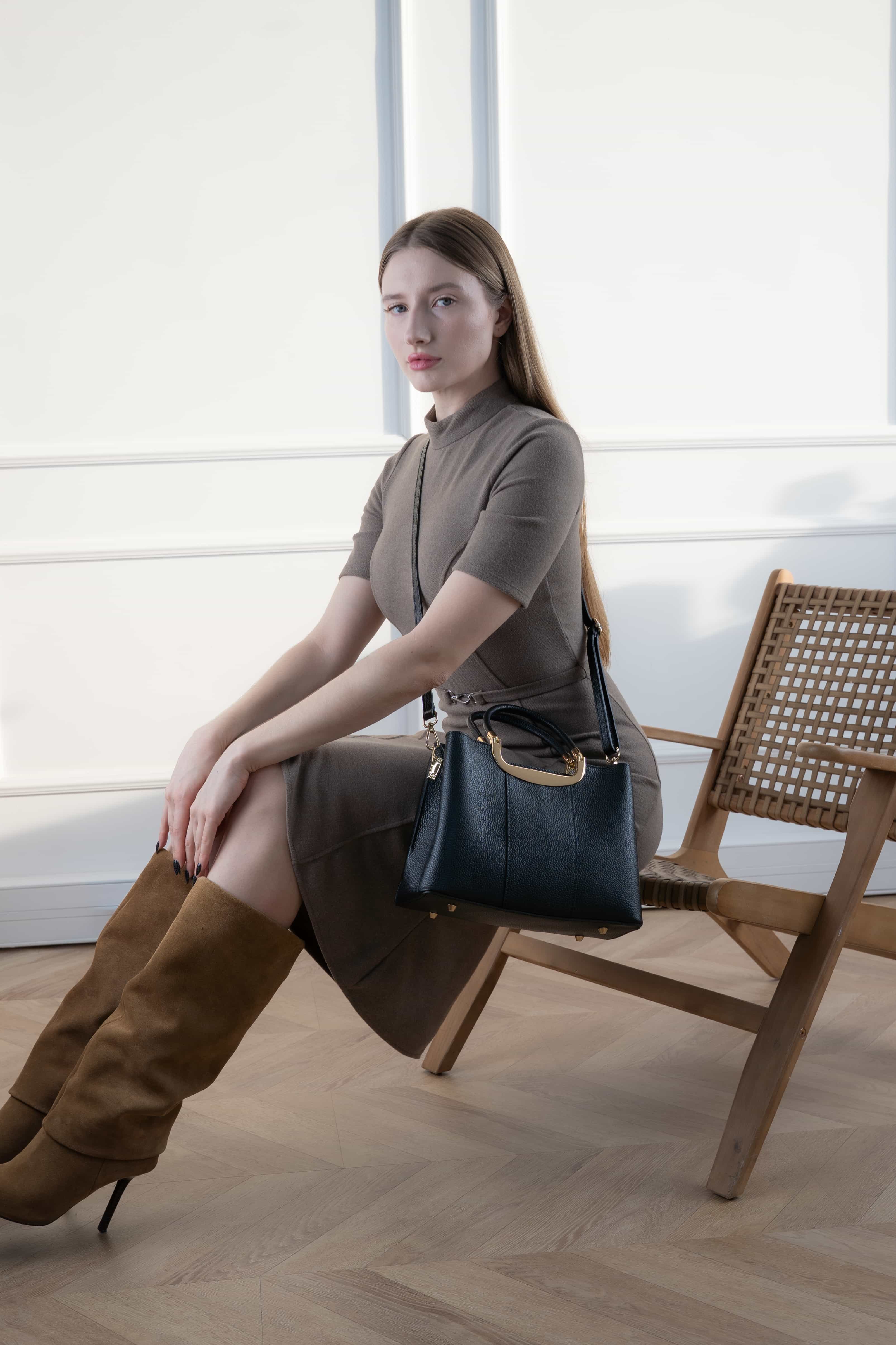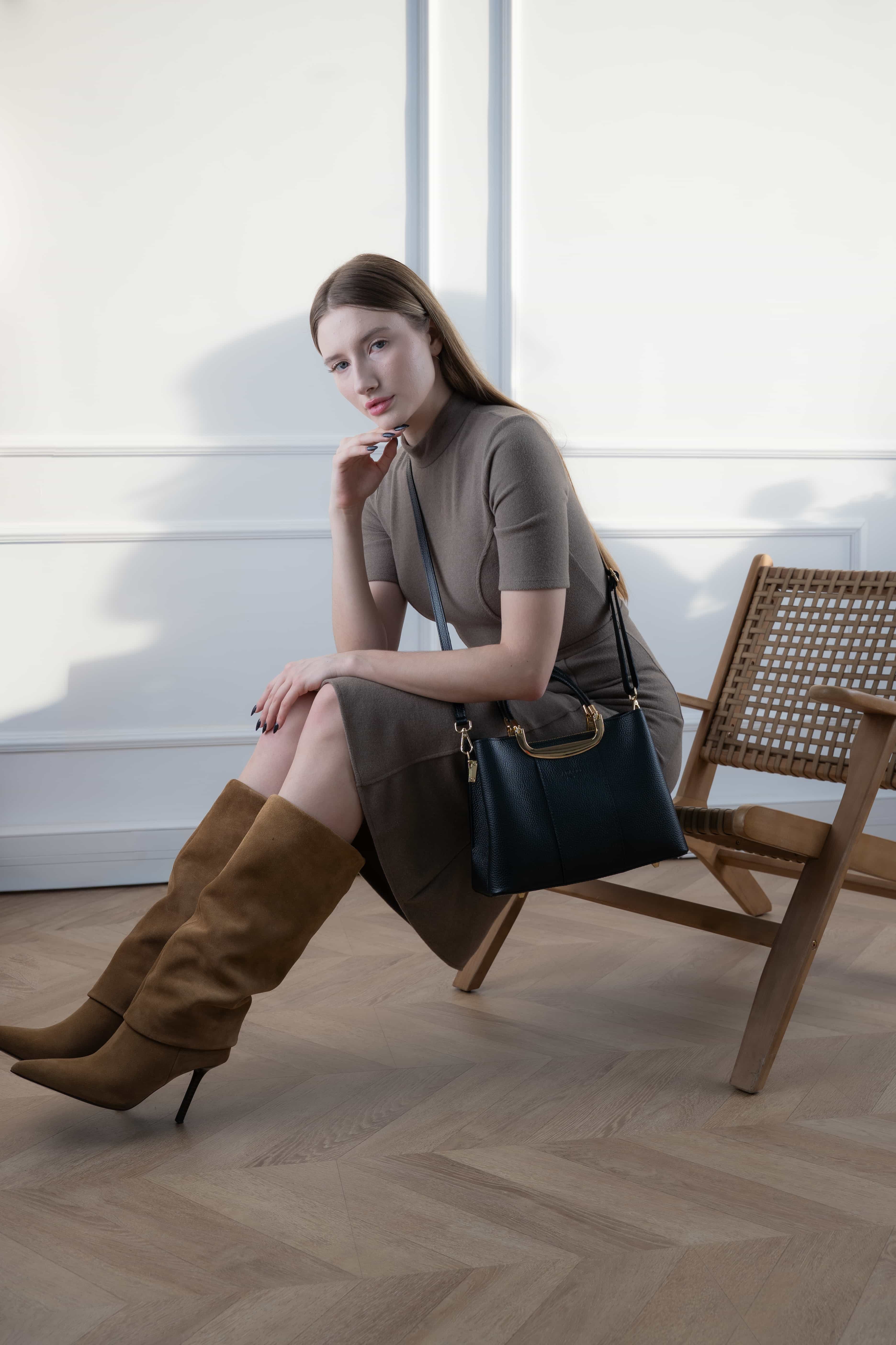 Le sac Olivia est un petit bijou de sophistication : une silhouette structurée en cuir de vachette, sublimée par une anse rigide ornée de métal doré façon bijou.