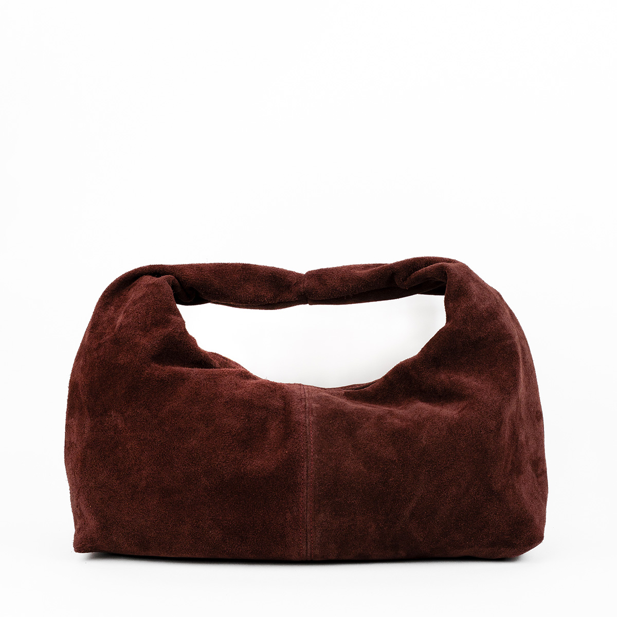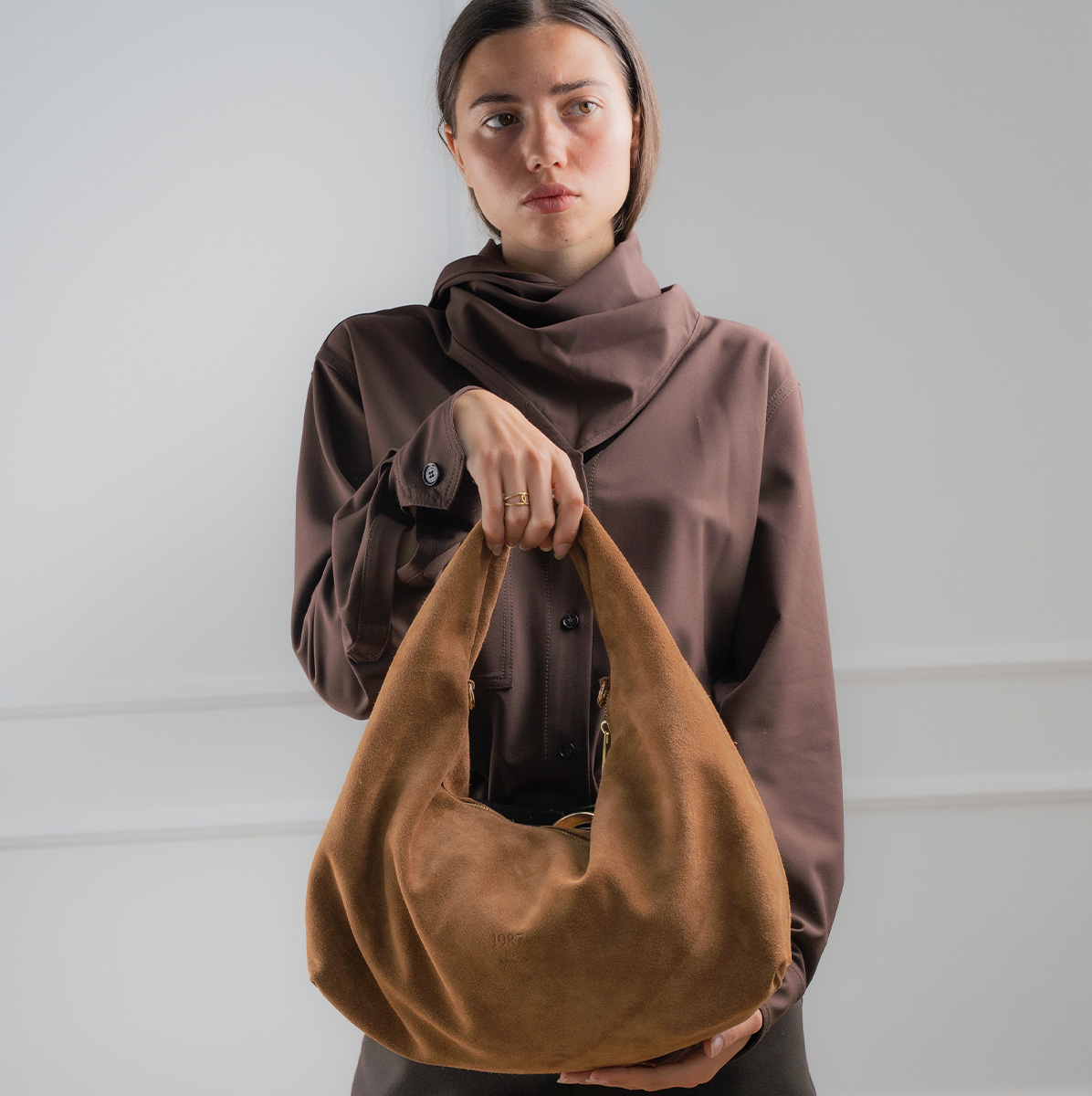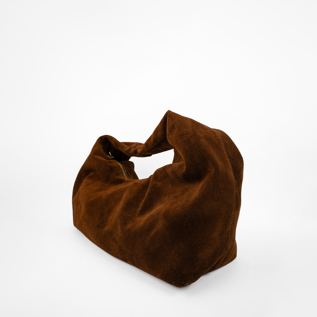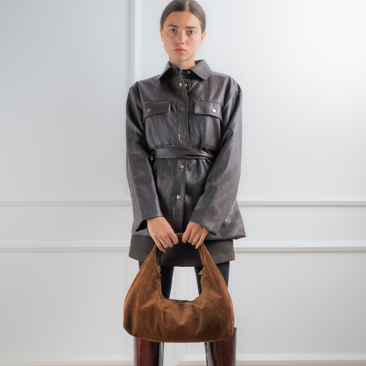 Confectionné en suédine pour un toucher doux et velouté, sa forme déstructurée lui confère une allure moderne et décontractée.
