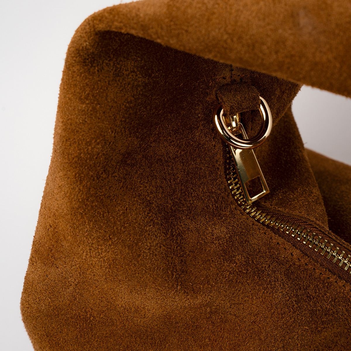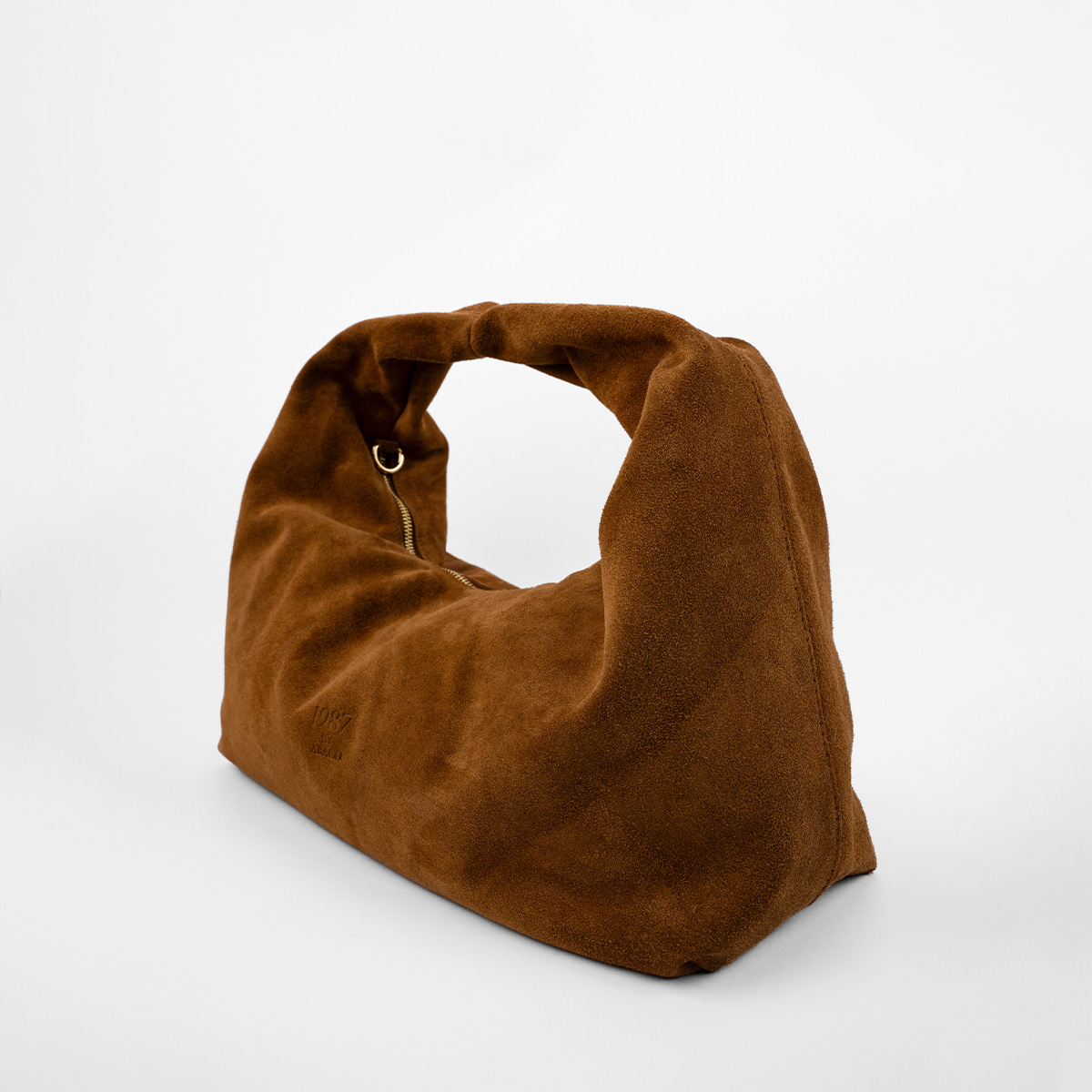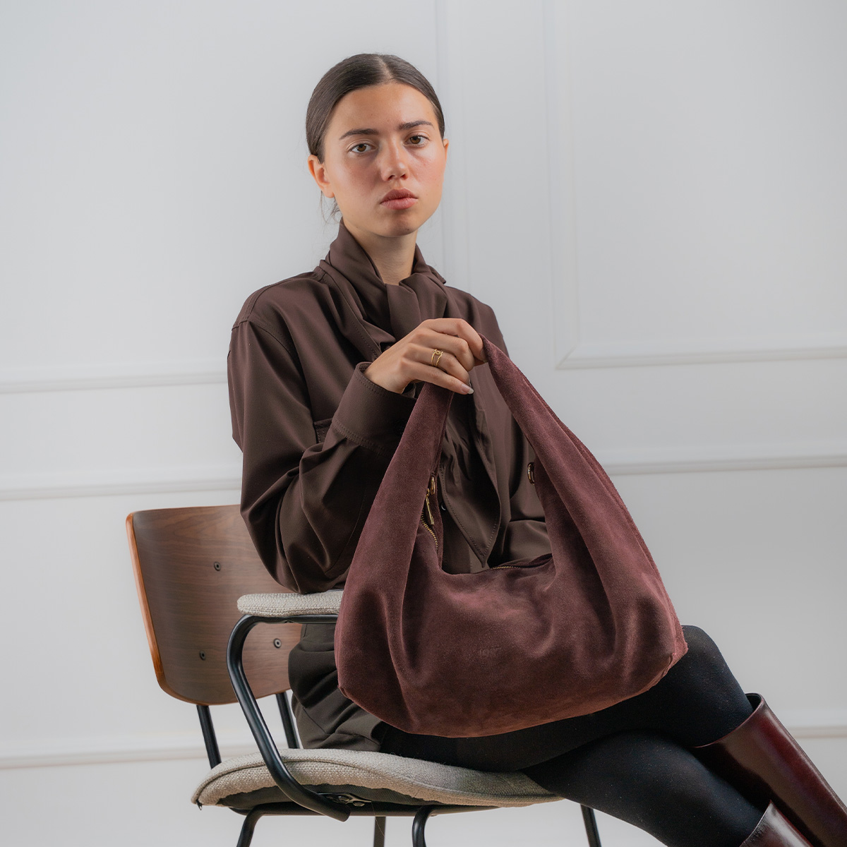 Confectionné en suédine pour un toucher doux et velouté, sa forme déstructurée lui confère une allure moderne et décontractée.