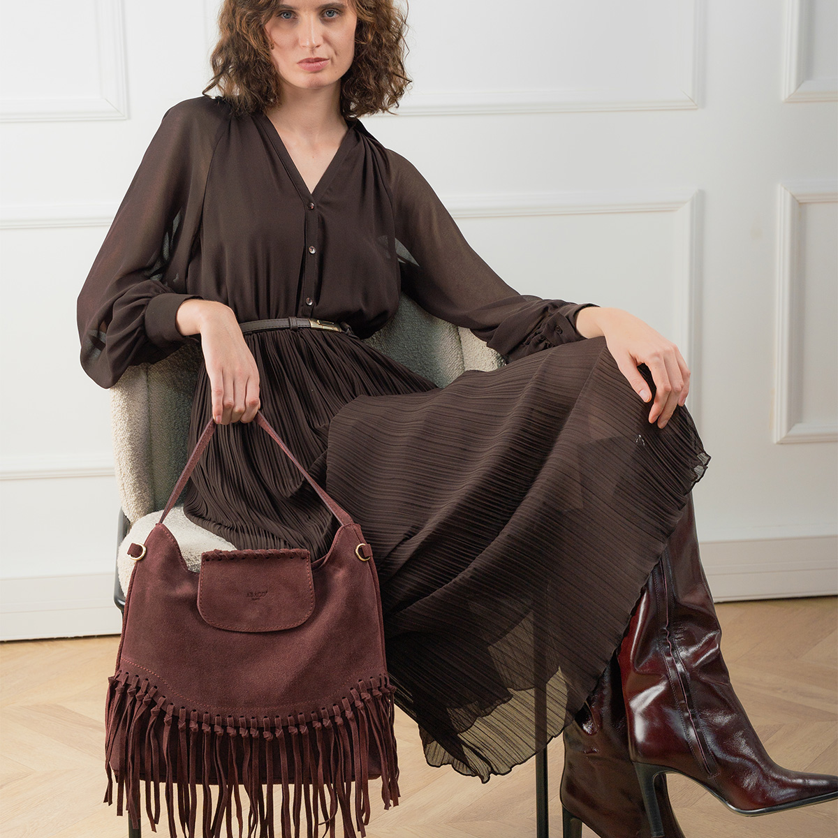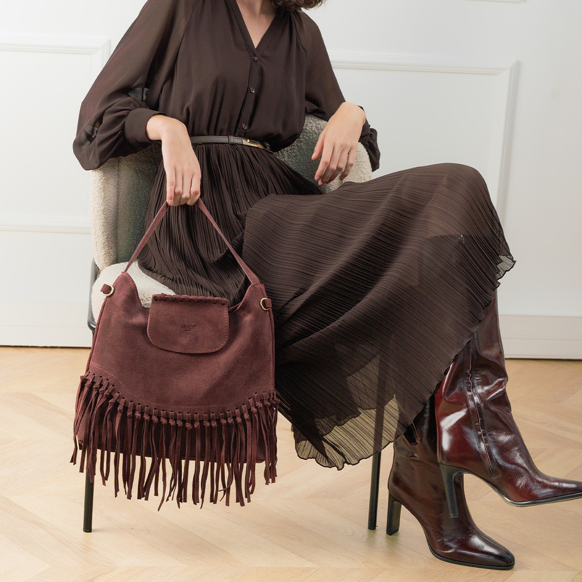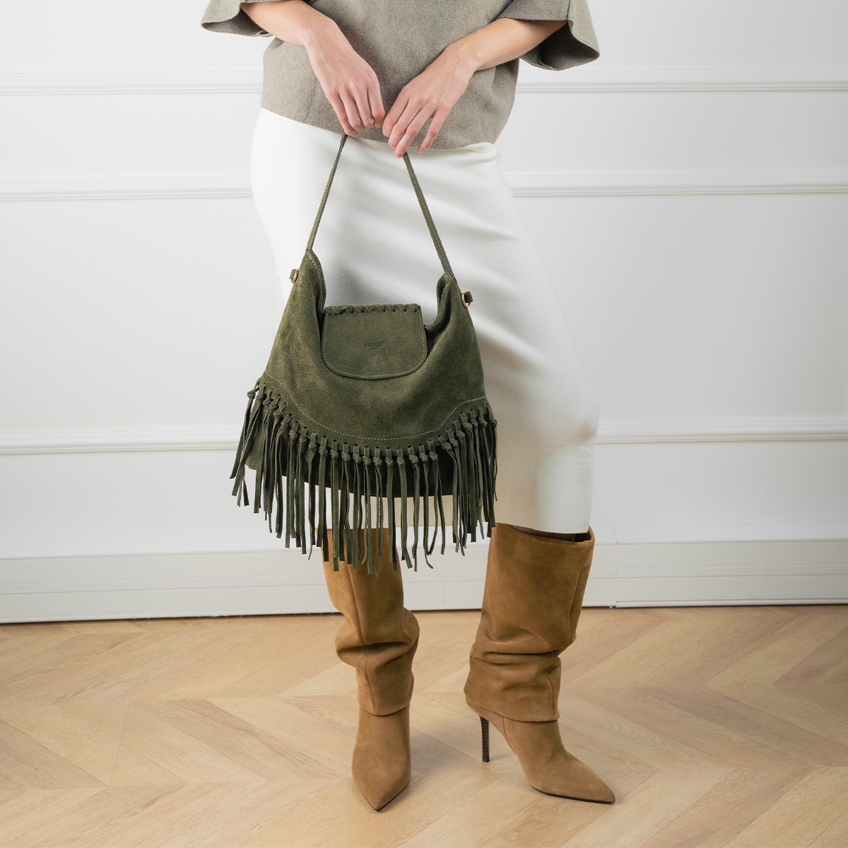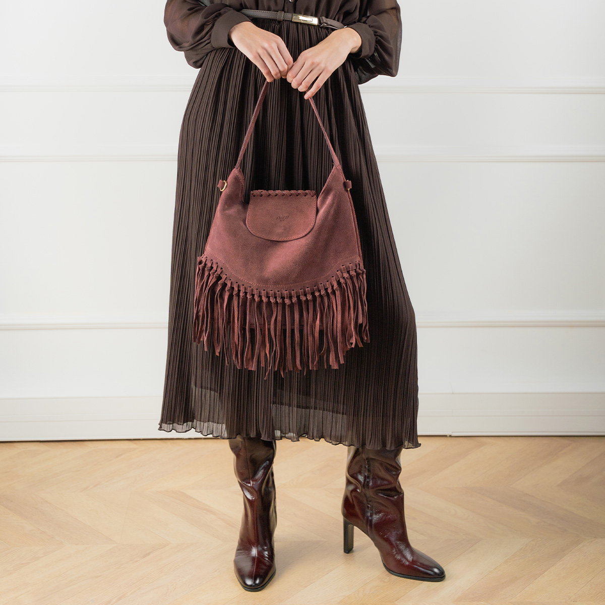 Le sac Vega est en cuir suédé orné de franges. Rabat aimanté et fermeture zippée, intérieur doublé avec poche, bandoulière ajustable. Une pièce bohème chic au caractère affirmé.