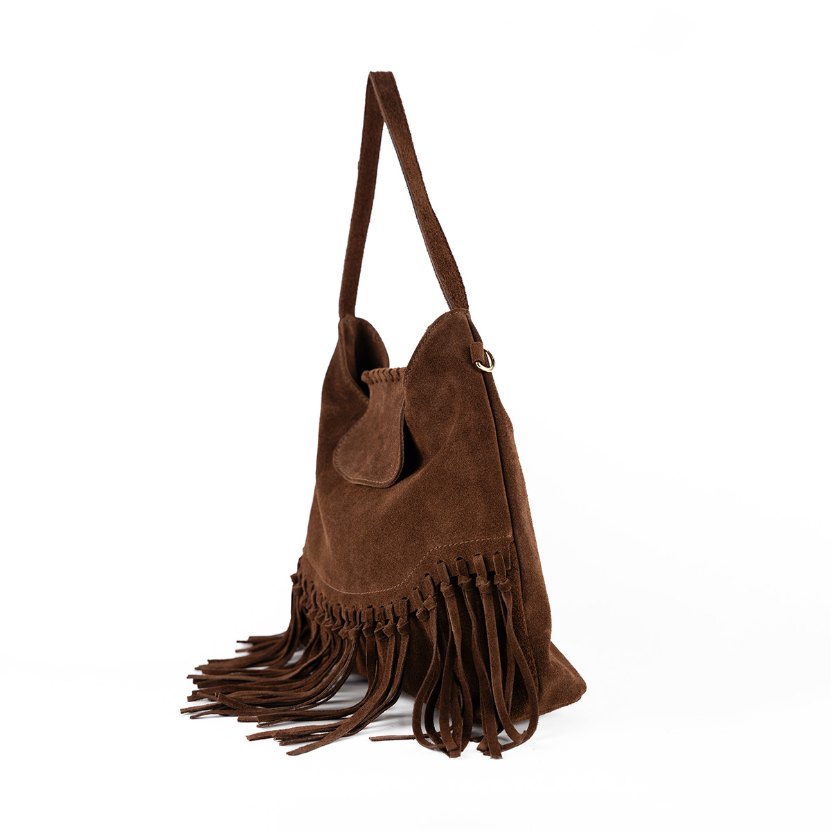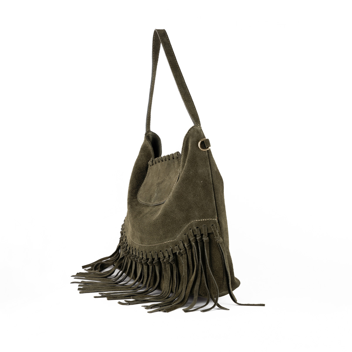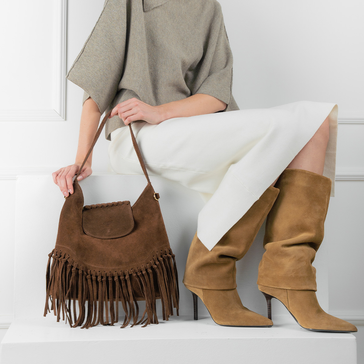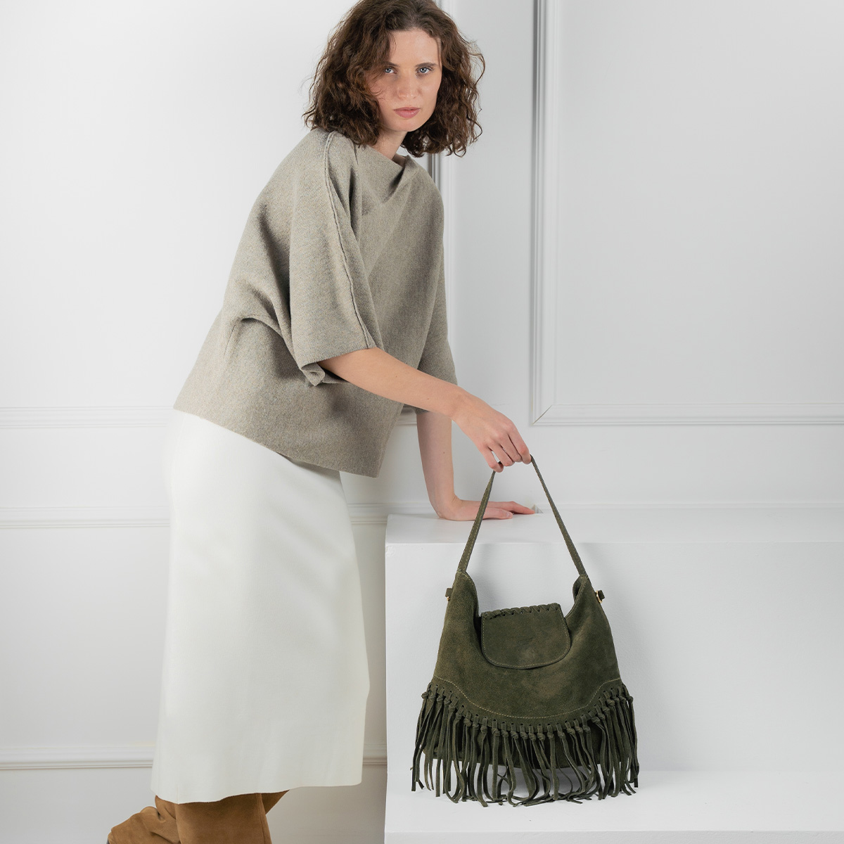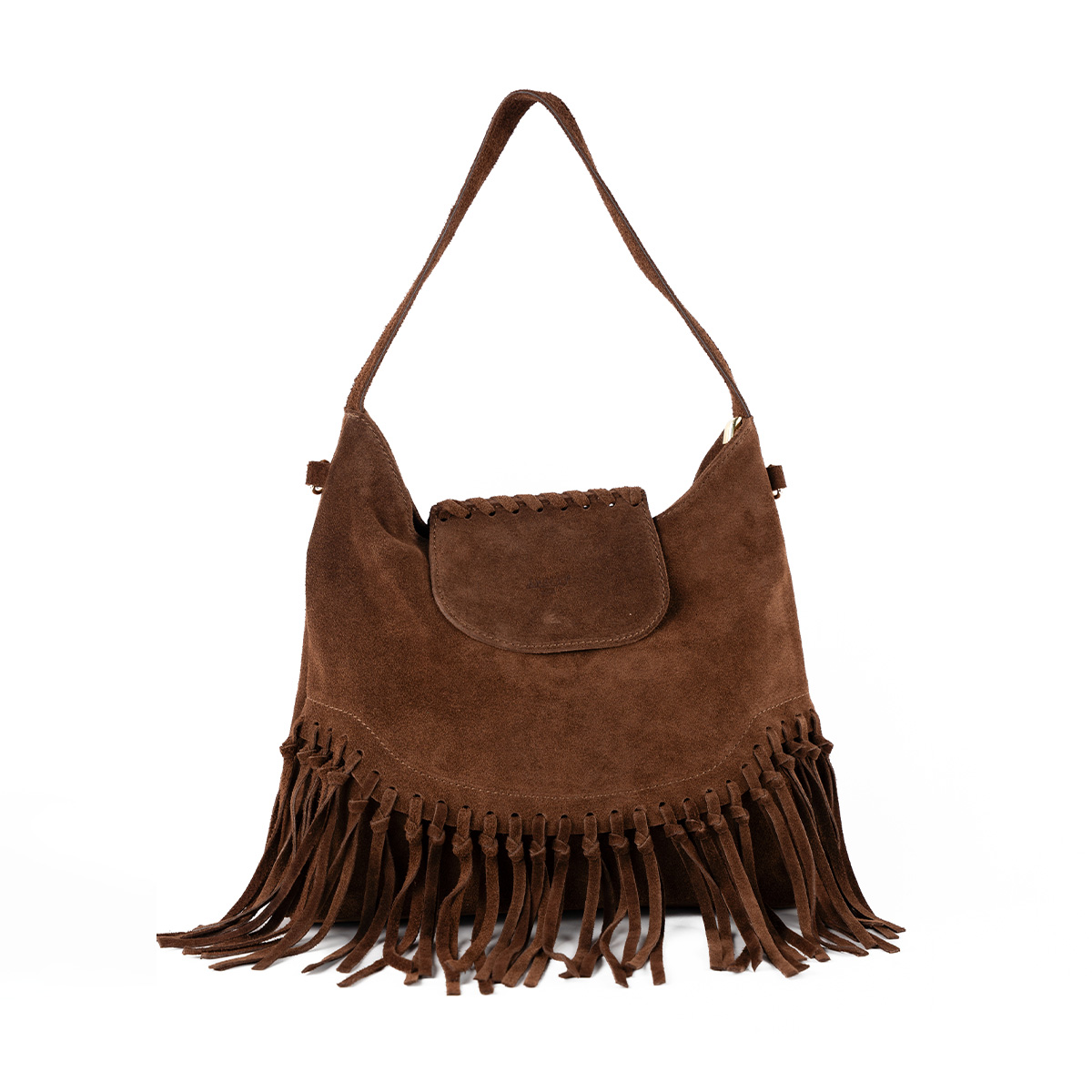 Le sac Vega est en cuir suédé orné de franges. Rabat aimanté et fermeture zippée, intérieur doublé avec poche, bandoulière ajustable. Une pièce bohème chic au caractère affirmé.