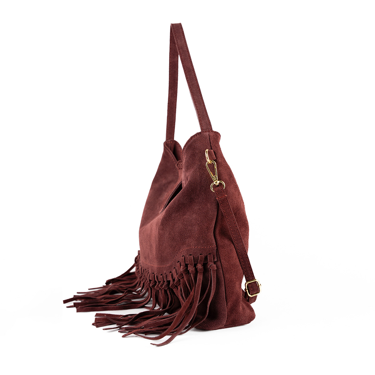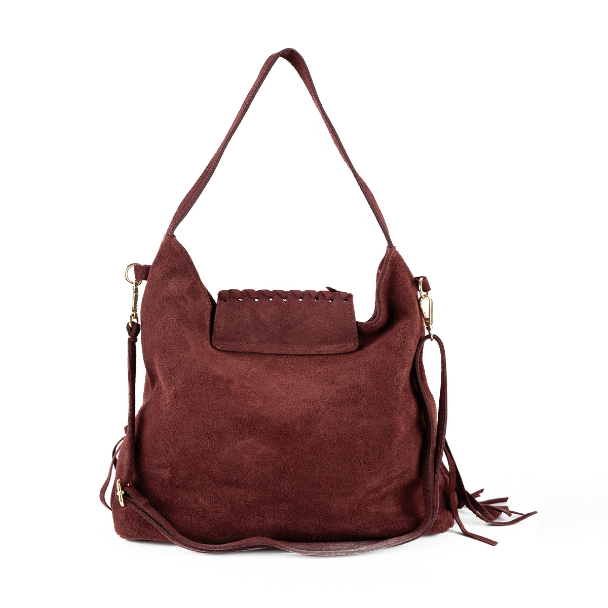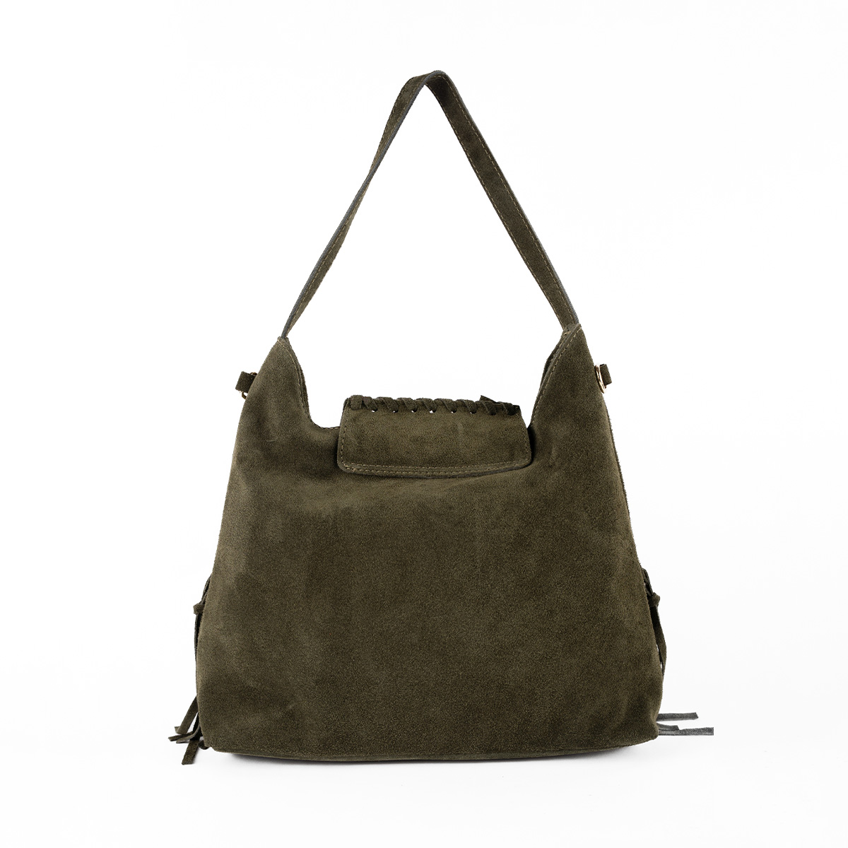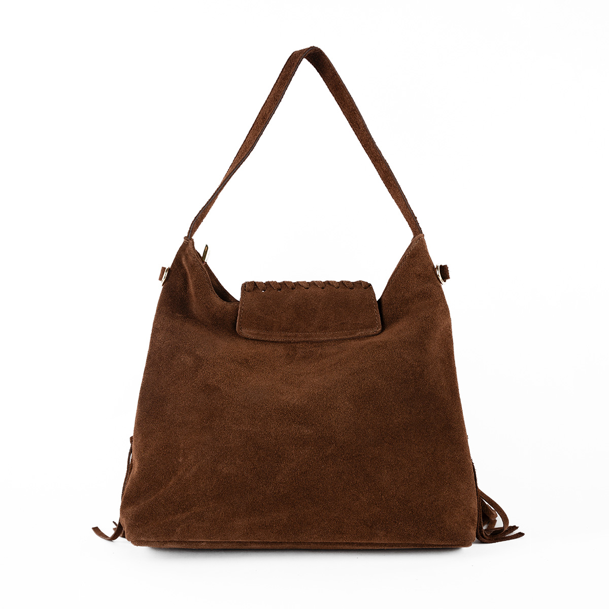Le sac Vega est en cuir suédé orné de franges. Rabat aimanté et fermeture zippée, intérieur doublé avec poche, bandoulière ajustable. Une pièce bohème chic au caractère affirmé.